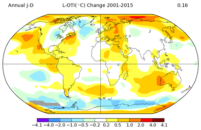 We can see that the average rate of global warming, although still on the increase, has halved during this time. Note the anomalously cool areas over the eastern US, southern Greenland and the northern Atlantic.
