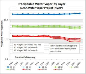 As covered previously, this revealed a decline in upper layer (around 18,000 to 30,000 feet) and middle layer (around 10,000 to 18,000 feet) water vapour from 1995 to 2001. The near-surface layer (surface to around 10,000 feet) shows an increase in water vapour from 1995 to 2001.